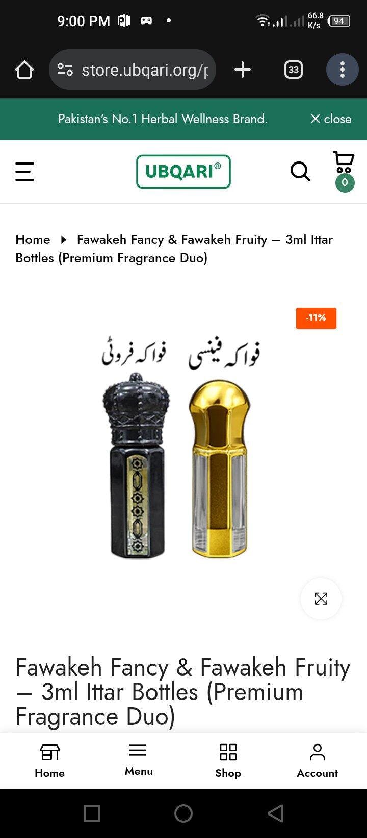 The Fawakeh Fancy & Fawakeh Fruity 3ml Ittar Bottles are premium, highly concentrated fragrances crafted for lovers of elegant and long-lasting scents.