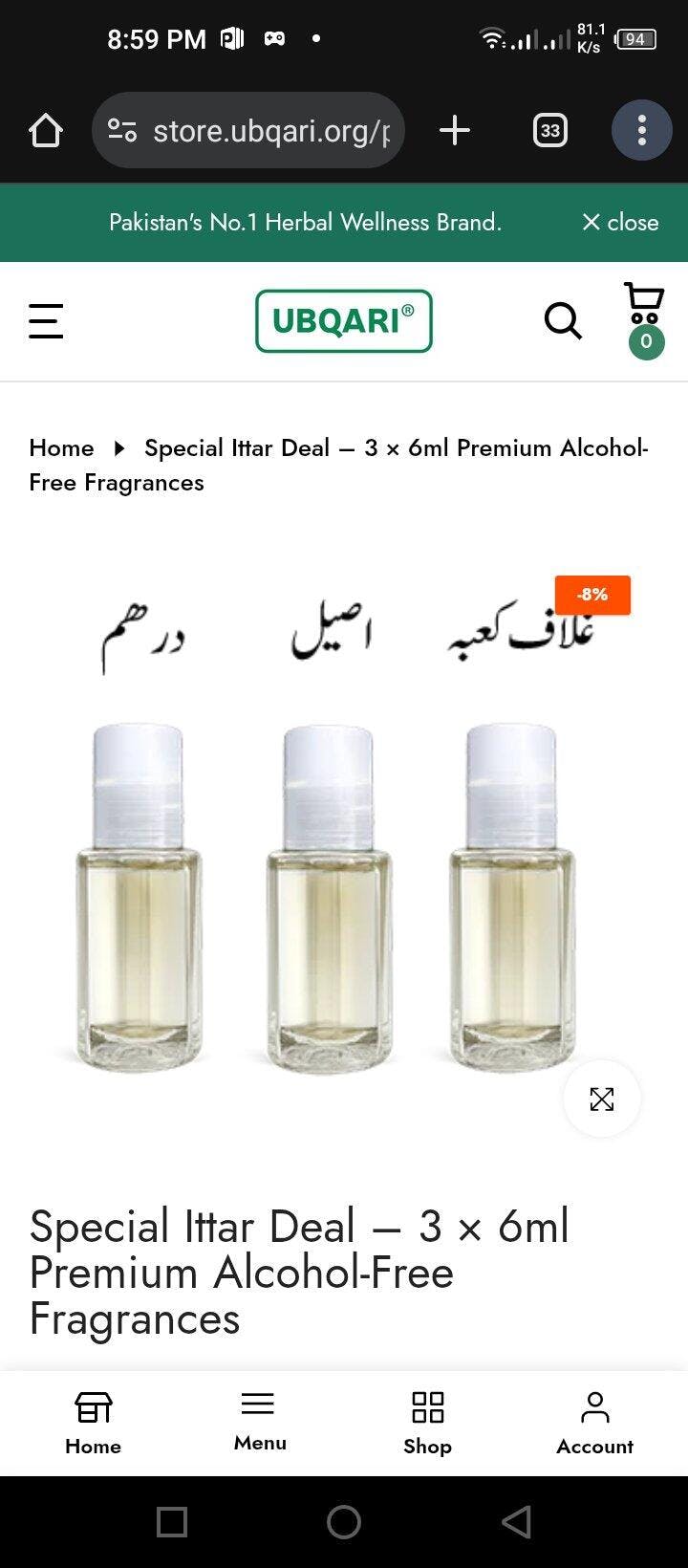 The Special Ittar Deal (6ml) is a premium fragrance combo featuring three 6ml ittar bottles.