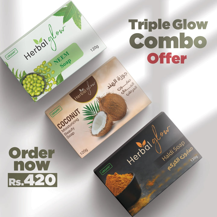 Experience deep cleansing, natural nourishment, and long-lasting freshness with the Herbal Glow Triple Glow Combo. This special offer includes three premium herbal soaps—Neem, Coconut, and Haldi—designed to keep your skin clean, soft, bright, and healthy.